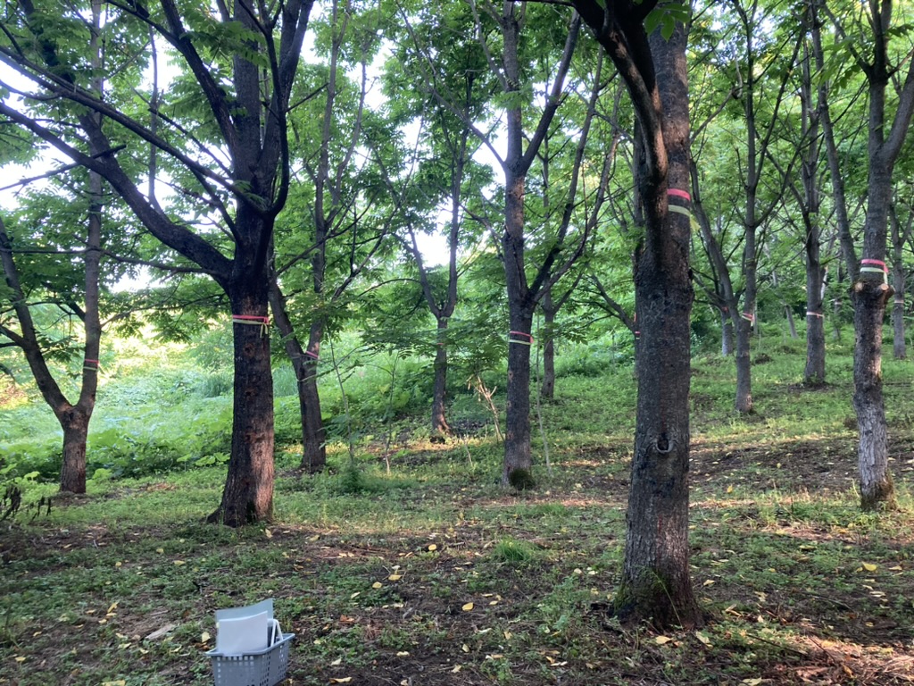 漆掻きを始める前に、木や土や天気の状態を確認・把握するところから始める。昨日まで暑く、雨も少なかった。葉が垂れたりするなど木も少し元気がなく、状況によってはもう1日空けて(つまり中4日、五日山)木を休ませたりする。