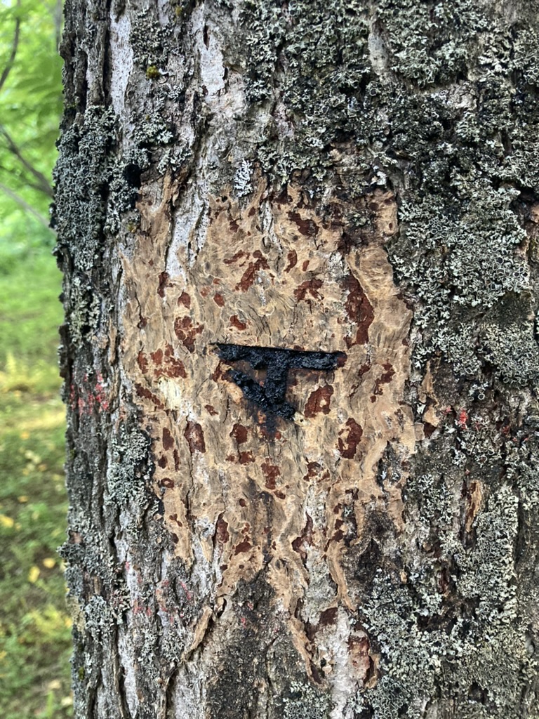上げ山で教わったことを思い出しながらまだおそるおそるやる。まずしっかりとカンナを樹皮に噛ませて、面に沿って引く。傷も水平を目指すが、どうも手前側が高くなってしまう。特に下の方の辺。傷の深さは浅くも深すぎることもないようにしたいが、その力の入れ具合も分からず、一気にカンナを引けなくて傷が直線ではなくうねうねになる。でも最後はうまく歯止めをきかせられなくて長くなってしまったり。下の写真をご覧あれ‥‥