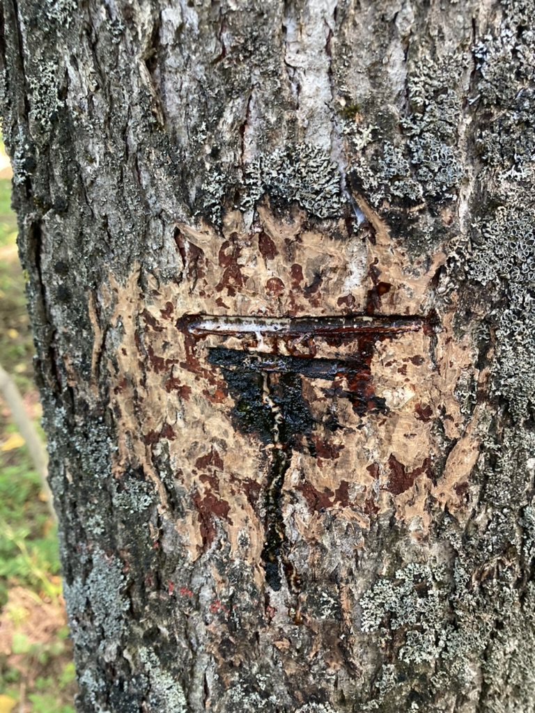 上げ山までの傷跡を見てみると、漆が傷をしっかり覆って(下に垂れているものの方が多いくらい)固まっていて、出や乾きがよさそうで安心する。というか上げ山の漆採った後も、こんなにたくさんの漆が出てるんだ。